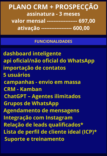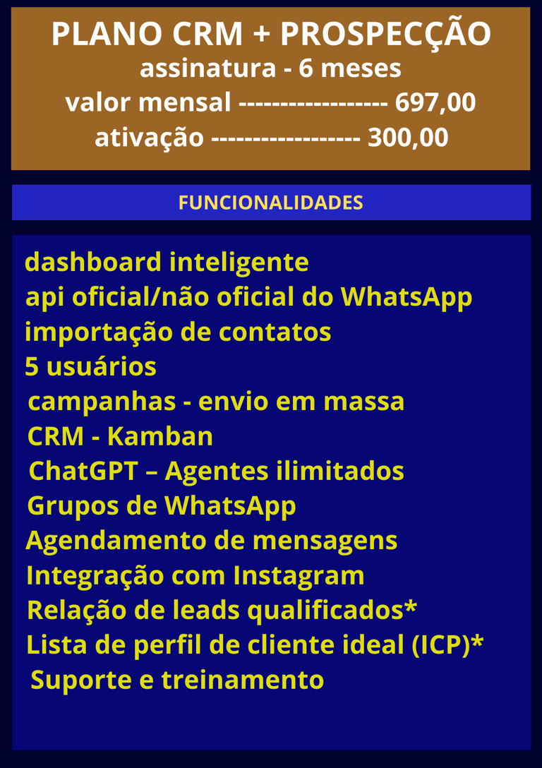 Nossos planos foram pensados para quem precisa organizar atendimentos, automatizar processos e estruturar a prospecção de clientes, com suporte técnico e orientação prática.